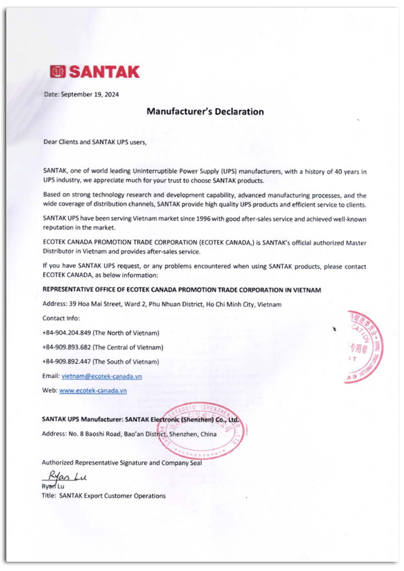 - Chứng thư xác nhận nhà phân phối SANTAK Download tại đây: CNPP 2026