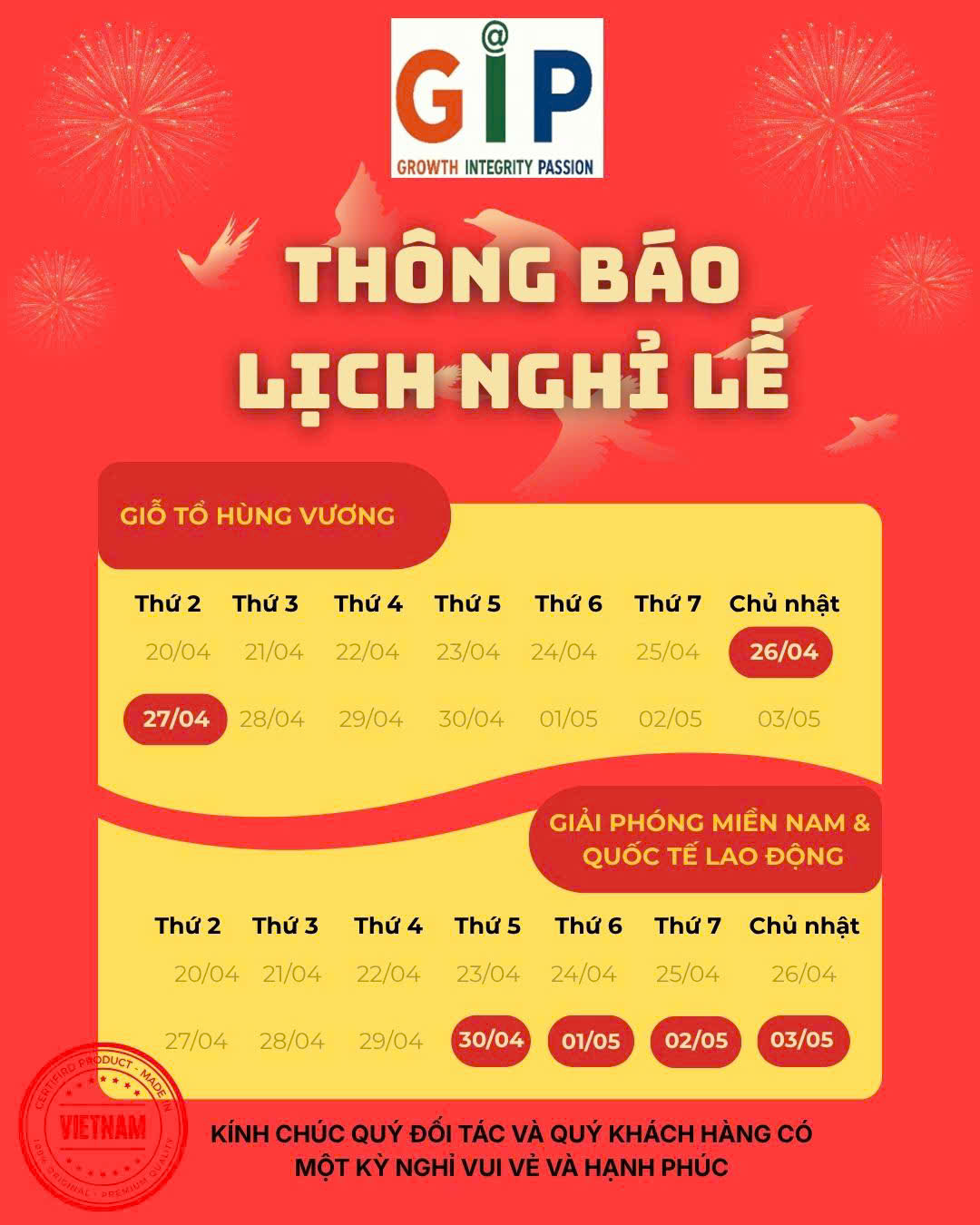 Trân trọng thông báo đến Quý Khách hàng lịch nghỉ lễ sắp tới như sau: